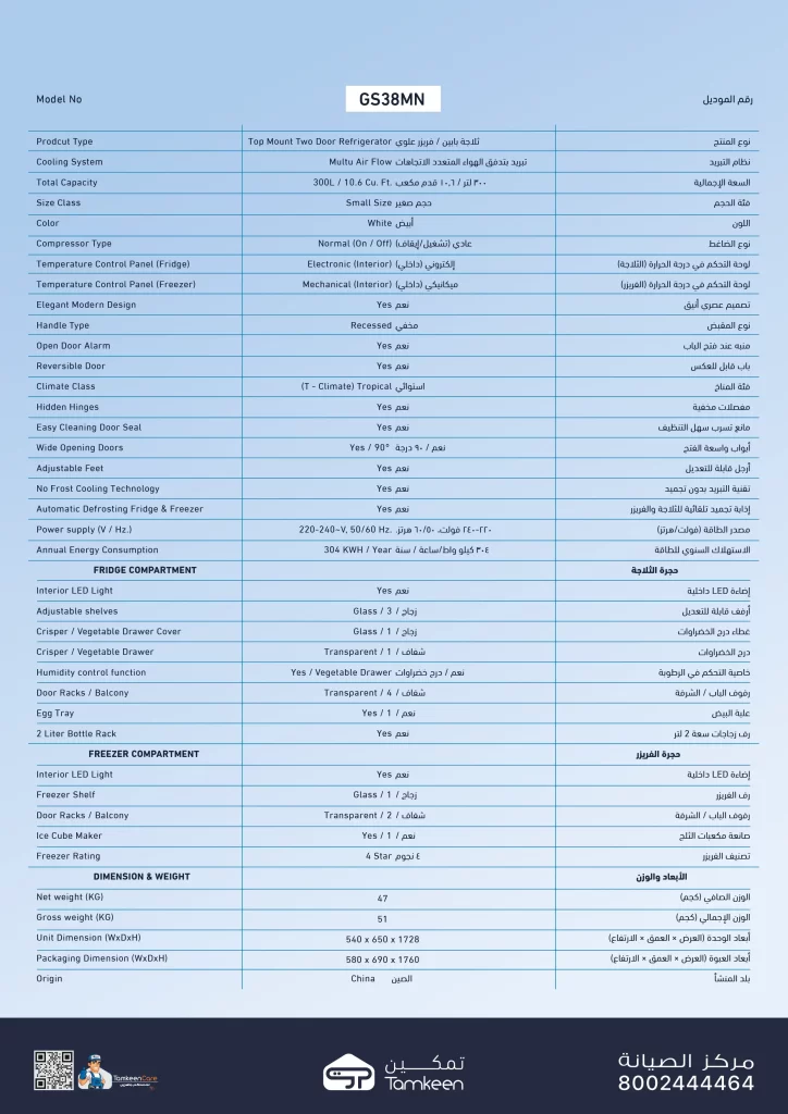 جنرال سوبريم ثلاجة بابين (10.6 قدم،300 لتر)، أبيض, GS38MN
