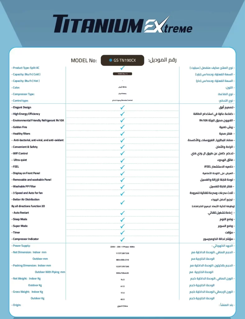 جنرال سوبريم مكيف هواء سبليت تيتانيوم اكستريم, سعة تبريد 19,000 وحدة, ريش ذهبية, تحكم واي فاي, منبه تنظيف الفلتر, خاصية الأستشعار.