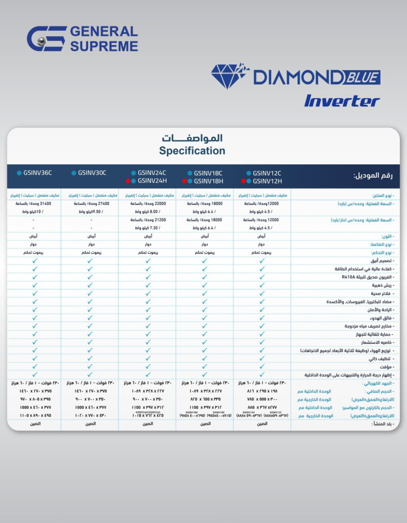 GSINV12C جنرال سوبريم مكيف سبليت دايموند بلو انفيرتر 12,000 وحدة، بارد